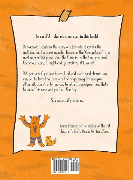 Be careful – there’s a monster in this book! Be warned: it contains the story of a boy who discovers the mythical and ferocious monster known as the "Grumpelpuss"– in a most unexpected place. And, the thing is, by the time you read the whole story, it might end up involving YOU as well! But, perhaps, if you are brave, kind, and make good choices, you can be a hero that conquers the frightening Grumpelpuss. After all, there’s only one way to set a Grumpelpuss free: that’s to unlock his cage, and you hold the key! So read on…if you dare…