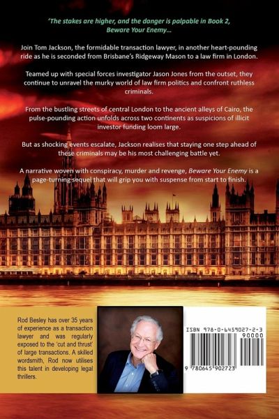 Dive into the heart-pounding sequel in Rod Besley's Tom Jackson Legal Thriller Series: Beware Your Enemy The stakes are higher, and the danger is palpable in Book 2, Beware Your Enemy... Join Tom Jackson, the formidable transaction lawyer, in another heart-pounding ride as he is seconded from Brisbane's Ridgeway Mason to a law firm in London. Teamed up with special forces investigator Jason Jones from the outset, they continue to unravel the murky world of law firm politics and confront ruthless criminals. From the bustling streets of central London to the ancient alleys of Cairo, the suspense unfolds across two continents as suspicions of illicit investor funding loom large. But as shocking events escalate, Jackson realises that staying one step ahead of these criminals may be his most challenging battle yet. A narrative woven with conspiracy, murder and revenge, Beware Your Enemy is a page-turning sequel that will grip you with suspense from start to finish. PRAISE FOR ROD BESLEY 'Comparisons with John Grisham and Vince Flynn are inevitable, but are they justified? Absolutely! There is no better test of a novel than whether you are able to put it down. Know Your Enemy passed that test with flying colours. This is a compelling piece of fiction, and to those of you in professional partnerships, you will appreciate more than most the intrigues of the character structures, the loyalties, personalities, greediness and sheer skull-duggery of those that sit around that large table. Rod has written this novel in short, fast-paced chapters - relatable characters, easy to read and full of suspense to the very end.' Michael Hawkins AM FAICD 'Fast-moving thriller that takes the reader at lightning pace through the ruthless world of illegal financing and boardroom chicanery. Rod Besley's background provides readers with an informed ringside seat to this dynamic, jolting tale set in a world of "whatever it takes". The characters come to life as you experience the gripping tension and right-hand turns through to the thrilling end. A great debut effort from the author from whom we will be waiting enthusiastically to hear more.' Greg Meek, former CEO 'Rod Besley delivers another dynamic legal thriller in Beware Your Enemy, taking readers on a cut-throat journey across Brisbane, Singapore, London, Cairo, Lyon and Sydney. Besley has crafted a new kind of lawyer hero, one for whom the sword is mightier than the pen....' Scott McDonald, Law Firm Partner 'Tom Jackson is fast developing into a cult hero; a hybrid of James Bond and a John Grisham protagonist. He requires all of the skills that this combination brings to him to navigate through the intrigue, danger and excitement that is Beware Your Enemy. Highly enjoyable.' Stephen Quartermain, Lawyer