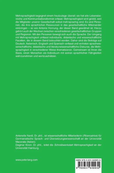 Mehrsprachigkeit begegnet einem heutzutage überall; sie hat alle Lebensbereiche und Kommunikationsformen erfasst. Mehrsprachigkeit wird gelebt, weil die Mitglieder unserer Gesellschaft selbst mehrsprachig sind. Es sind Personen, die ihre sprachlichen Ressourcen in das gesellschaftliche Miteinander einbringen - so wie Antonie Hornung, der dieser Band gewidmet ist. Hierzu gehört auch der Wechsel zwischen verschiedenen gesellschaftlichen Gruppen und Regionen. Mit den Personen bewegt sich auch die Sprache. Der Umgang mit Mehrsprachigkeit umfasst individuelle, didaktische und wissenschaftliche Facetten, die in diesem Band beleuchtet werden. Daher sind die Beiträge auf Deutsch, Italienisch, Englisch und Spanisch verfasst und vertreten sprachwissenschaftliche, didaktische und literaturwissenschaftliche Diskurse, die Mehrsprachigkeit in verschiedener Weise thematisieren. Gemeinsam ist ihnen die Basis, einen Menschen als Individuum mit seinen sprachlichen Fähigkeiten wahrzunehmen und wertzuschätzen.
