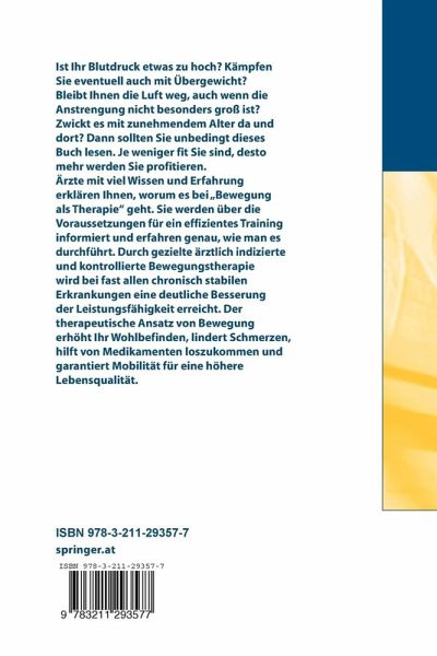Die dosierte körperliche Belastung ist mittlerweile zum festen therapeutischen Bestandteil bei zahlreichen Erkrankungen geworden, da es nur wenige medizinische Gründe für absolute Schonung und Ruhe gibt. In diesem prägnanten Handbuch wird die Bewegungstherapie als zusätzlicher therapeutischer Grundpfeiler praxisrelevant von im Sportbereich erfahrenen und tätigen Medizinern dargestellt. Die zweite Auflage wurde um ein Kapitel zu psychiatrischen Erkrankungen, wie Depression, Schizophrenie, u. a. erweitert. Ein weiterer Schwerpunkt liegt auf der Prävention von häufigen Zivilisationskrankheiten. Nach einer kurzen Beschreibung der jeweiligen Krankheit werden häufig auftretende Fragen aus der Praxis beantwortet, wie etwa Nutzen, Dauer, Intensität oder Risiko der Bewegung. Falldiskussionen und Beispiele aus der Praxis runden die einzelnen Beiträge ab. Das leicht verständliche Buch richtet sich an interessierte Laien, die an Zivilisationskrankheiten leiden sowie an Physiotherapeuten,Trainer und Sportmediziner.