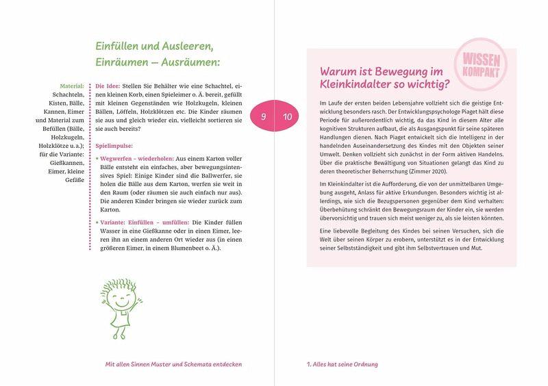 Renate Zimmer, die selbst zahlreiche Erfahrungen in Bezug auf die Bewegungserziehung von Kindern gesammelt hat, teilt ihr wertvolles Wissen und ihre Expertise in diesem Buch. Das Buch ist sehr schön aufgemacht und gestaltet. Die Themen, zu denen praktische Übungen aufgeführt werden, sind gut gewählt, immer noch einmal gut erläutert und es werden hilfreiche Hintergrundinformationen gegeben. Die praktischen Übungen, die Zimmer empfiehlt, eignen sich meiner Meinung nach hervorragend für Kinder unter drei Jahren, für die man Bewegung erlebbar machen möchte. Sie sind gut verständlich und benötigen nicht viele Materialien.