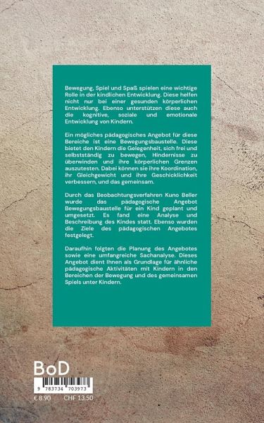 Bewegung, Spiel und Spaß spielen eine wichtige Rolle in der kindlichen Entwicklung. Diese helfen nicht nur bei einer gesunden körperlichen Entwicklung. Ebenso unterstützen diese auch die kognitive, soziale und emotionale Entwicklung von Kindern.Ein mögliches pädagogisches Angebot für diese Bereiche ist eine Bewegungsbaustelle. Diese bietet den Kindern die Gelegenheit, sich frei und selbstständig zu bewegen, Hindernisse zu überwinden und ihre körperlichen Grenzen auszutesten. Dabei können sie ihre Koordination, ihr Gleichgewicht und ihre Geschicklichkeit verbessern, und das gemeinsam.Durch das Beobachtungsverfahren Kuno Beller wurde das pädagogische Angebot Bewegungsbaustelle für ein Kind geplant und umgesetzt. Es fand eine Analyse und Beschreibung des Kindes statt. Ebenso wurden die Ziele des pädagogischen Angebotes festgelegt.Daraufhin folgten die Planung des Angebotes sowie eine umfangreiche Sachanalyse. Dieses Angebot dient Ihnen als Grundlage für ähnliche pädagogische Aktivitäten mit Kindern in den Bereichen der Bewegung und des gemeinsamen Spiels unter Kindern. Erfahren Sie mehr über die wissenschaftlichen Sichtweisen und erhalten Sie grundlegendes Wissen.