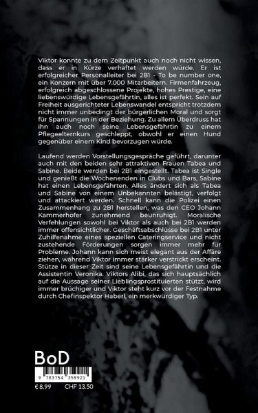 Viktor konnte zu dem Zeitpunkt auch noch nicht wissen, dass er in Kürze verhaftet werden würde. Er ist erfolgreicher Personalleiter bei 2B1 - To be number one, ein Konzern mit über 7.000 Mitarbeitern. Firmenfahrzeug, erfolgreich abgeschlossene Projekte, hohes Prestige, eine liebenswürdige Lebensgefährtin, alles ist perfekt. Sein auf Freiheit ausgerichteter Lebenswandel entspricht trotzdem nicht immer unbedingt der bürgerlichen Moral und sorgt für Spannungen in der Beziehung. Zu allem Überdruss hat ihn auch noch seine Lebensgefährtin zu einem Pflegeelternkurs geschleppt, obwohl er einen Hund gegenüber einem Kind bevorzugen würde.Laufend werden Vorstellungsgespräche geführt, darunter auch mit den beiden sehr attraktiven Frauen Tabea und Sabine. Beide werden bei 2B1 eingestellt. Tabea ist Single und genießt die Wochenenden in Clubs und Bars, Sabine hat einen Lebensgefährten. Alles ändert sich als Tabea und Sabine von einem Unbekannten belästigt, verfolgt und attackiert werden. Schnell kann die Polizei einen Zusammenhang zu 2B1 herstellen, was den CEO Johann Kammerhofer zunehmend beunruhigt. Moralische Verfehlungen sowohl bei Viktor als auch bei 2B1 werden immer offensichtlicher. Geschäftsabschlüsse bei 2B1 unter Zuhilfenahme eines speziellen Cateringservice und nicht zustehende Förderungen sorgen immer mehr für Probleme. Johann kann sich meist elegant aus der Affäre ziehen, während Viktor immer stärker verstrickt erscheint. Stütze in dieser Zeit sind seine Lebensgefährtin und die Assistentin Veronika. Viktors Alibi, das sich hauptsächlich auf die Aussage seiner Lieblingsprostituierten stützt, wird immer brüchiger und Viktor steht kurz vor der Festnahme durch Chefinspektor Haberl, ein merkwürdiger Typ.