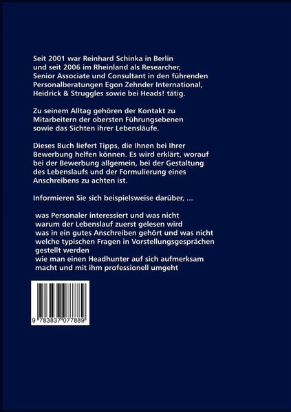 "Bewerbungstipps aus Personalberater-Sicht" erklärt, worauf bei der Bewerbung allgemein, bei der Gestaltung des Lebenslaufs und der Formulierung eines Anschreibens zu achten ist. Das Buch liefert somit wertvolle Tipps, die Ihnen bei Ihrer Bewerbung helfen können:- Was Personaler interessiert und was nicht!- Warum der Lebenslauf zuerst gelesen wird!- Was in ein gutes Anschreiben gehört und was nicht!- Welche typischen Fragen in Vorstellungsgesprächen gestellt werden!- Wie man einen Headhunter auf sich aufmerksam macht und mit ihm professionell umgeht!