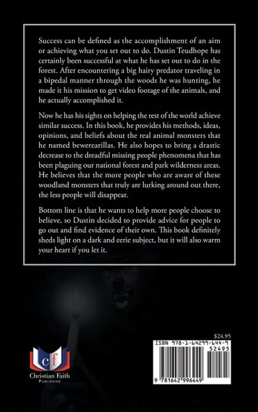 Success can be defined as the accomplishment of an aim or achieving what you set out to do. Dustin Teudhope has certainly been successful at what he has set out to do in the forest. After encountering a big hairy predator traveling in a bipedal manner through the woods he was hunting, he made it his mission to get video footage of the animals, and he actually accomplished it. Now he has his sights on helping the rest of the world achieve similar success. In this book, he provides his methods, ideas, opinions, and beliefs about the real animal monsters that he named bewerearillas. He also hopes to bring a drastic decrease to the dreadful missing people phenomena that has been plaguing our national forest and park wilderness areas. He believes that the more people who are aware of these woodland monsters that truly are lurking around out there, the less people will disappear. Bottom line is that he wants to help more people choose to believe, so Dustin decided to provide advice for people to go out and find evidence of their own. This book definitely sheds light on a dark and eerie subject, but it will also warm your heart if you let it.