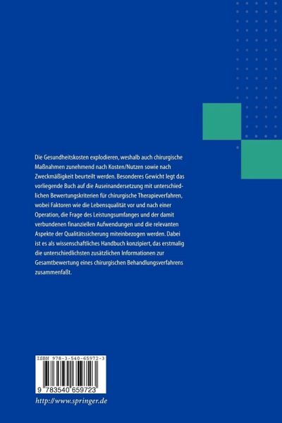 Die Gesundheitskosten explodieren, weshalb auch chirurgische Maßnahmen zunehmend auf Kosten/Nutzen sowie auf Notwendigkeit bewertet werden. Besonderes Gewicht legt das vorliegende Buch auf die Auseinandersetzung mit unterschiedlichen Bewertungskriterien für chirurgische Therapieverfahren, wobei Faktoren wie die Lebensqualität vor und nach der Operation, die Frage des Leistungsumfanges und der damit verbundenen finanziellen Aufwendungen und die relevanten Aspekte der Qualitätssicherung einbezogen werden. Dabei ist es als wissenschaftliches Handbuch konzipiert, das erstmalig die unterschiedlichsten zusätzlichen Informationen zur Gesamtbewertung eines chirurgischen Behandlungsverfahrens zusammenfaßt.