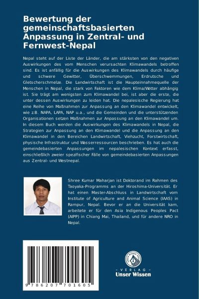 Nepal steht auf der Liste der Länder, die am stärksten von den negativen Auswirkungen des vom Menschen verursachten Klimawandels betroffen sind. Es ist anfällig für die Auswirkungen des Klimawandels durch häufige und schwere Gewitter, Überschwemmungen, Erdrutsche und Gletscherschmelze. Die Landwirtschaft ist die Haupteinnahmequelle der Menschen in Nepal, die stark von Faktoren wie dem Klima/Wetter abhängig ist. Sie trägt am wenigsten zum Klimawandel bei, ist aber die erste, die unter dessen Auswirkungen zu leiden hat. Die nepalesische Regierung hat eine Reihe von Maßnahmen zur Anpassung an den Klimawandel entwickelt, wie z.B. NAPA, LAPA, NAP u.a., und die Gemeinden und die unterstützenden Organisationen setzen Maßnahmen zur Anpassung an den Klimawandel um. In diesem Buch werden die Auswirkungen des Klimawandels in Nepal, die Strategien zur Anpassung an den Klimawandel und die Anpassung an den Klimawandel in den Bereichen Landwirtschaft, Viehzucht, Forstwirtschaft, physische Infrastruktur und Wasserressourcen beschrieben. Es hat auch die gemeindebasierten Anpassungen im nepalesischen Kontext erfasst, einschließlich zweier spezifischer Fälle von gemeindebasierten Anpassungen aus Zentral- und Westnepal.