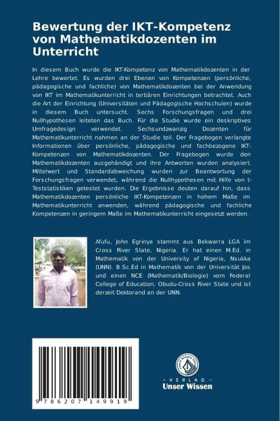 In diesem Buch wurde die IKT-Kompetenz von Mathematikdozenten in der Lehre bewertet. Es wurden drei Ebenen von Kompetenzen (persönliche, pädagogische und fachliche) von Mathematikdozenten bei der Anwendung von IKT im Mathematikunterricht in tertiären Einrichtungen betrachtet. Auch die Art der Einrichtung (Universitäten und Pädagogische Hochschulen) wurde in diesem Buch untersucht. Sechs Forschungsfragen und drei Nullhypothesen leiteten das Buch. Für die Studie wurde ein deskriptives Umfragedesign verwendet. Sechsundzwanzig Dozenten für Mathematikunterricht nahmen an der Studie teil. Der Fragebogen verlangte Informationen über persönliche, pädagogische und fachbezogene IKT-Kompetenzen von Mathematikdozenten. Der Fragebogen wurde den Mathematikdozenten ausgehändigt und ihre Antworten wurden analysiert. Mittelwert und Standardabweichung wurden zur Beantwortung der Forschungsfragen verwendet, während die Nullhypothesen mit Hilfe von t-Teststatistiken getestet wurden. Die Ergebnisse deuten darauf hin, dass Mathematikdozenten persönliche IKT-Kompetenzen in hohem Maße im Mathematikunterricht anwenden, während pädagogische und fachliche Kompetenzen in geringem Maße im Mathematikunterricht eingesetzt werden.