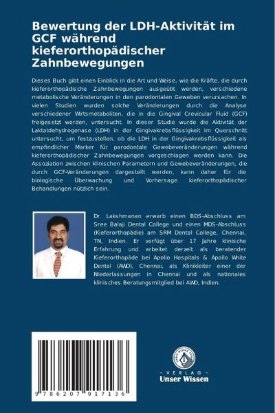 Dieses Buch gibt einen Einblick in die Art und Weise, wie die Kräfte, die durch kieferorthopädische Zahnbewegungen ausgeübt werden, verschiedene metabolische Veränderungen in den parodontalen Geweben verursachen. In vielen Studien wurden solche Veränderungen durch die Analyse verschiedener Wirtsmetaboliten, die in die Gingival Crevicular Fluid (GCF) freigesetzt werden, untersucht. In dieser Studie wurde die Aktivität der Laktatdehydrogenase (LDH) in der Gingivakrebsflüssigkeit im Querschnitt untersucht, um festzustellen, ob die LDH in der Gingivakrebsflüssigkeit als empfindlicher Marker für parodontale Gewebeveränderungen während kieferorthopädischer Zahnbewegungen vorgeschlagen werden kann. Die Assoziation zwischen klinischen Parametern und Gewebeveränderungen, die durch GCF-Veränderungen dargestellt werden, kann daher für die biologische Überwachung und Vorhersage kieferorthopädischer Behandlungen nützlich sein.