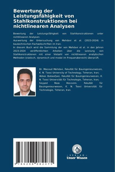 Bewertung der Leistungsfähigkeit von Stahlkonstruktionen unter nichtlinearen Analysen.Auswertung der Untersuchung von Mahdavi et al. (2023-2024) in bautechnischen Fachzeitschriften im Iran.In diesem Buch wird die Sammlung der von Mahdavi et al. in den Jahren 2023-2024 veröffentlichten Arbeiten über die Leistung von Stahlkonstruktionen mit einer Vielzahl von nichtlinearen analytischen Methoden (statisch, dynamisch und modal im Frequenzbereich) überprüft.