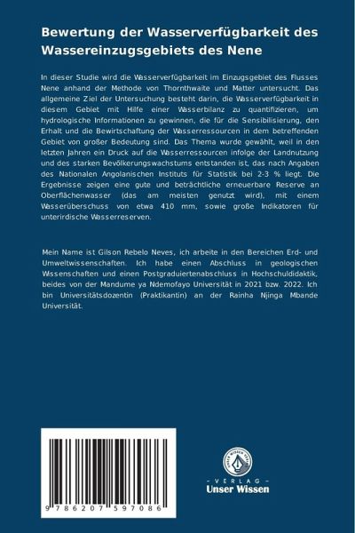 In dieser Studie wird die Wasserverfügbarkeit im Einzugsgebiet des Flusses Nene anhand der Methode von Thornthwaite und Matter untersucht. Das allgemeine Ziel der Untersuchung besteht darin, die Wasserverfügbarkeit in diesem Gebiet mit Hilfe einer Wasserbilanz zu quantifizieren, um hydrologische Informationen zu gewinnen, die für die Sensibilisierung, den Erhalt und die Bewirtschaftung der Wasserressourcen in dem betreffenden Gebiet von großer Bedeutung sind. Das Thema wurde gewählt, weil in den letzten Jahren ein Druck auf die Wasserressourcen infolge der Landnutzung und des starken Bevölkerungswachstums entstanden ist, das nach Angaben des Nationalen Angolanischen Instituts für Statistik bei 2-3 % liegt. Die Ergebnisse zeigen eine gute und beträchtliche erneuerbare Reserve an Oberflächenwasser (das am meisten genutzt wird), mit einem Wasserüberschuss von etwa 410 mm, sowie große Indikatoren für unterirdische Wasserreserven.