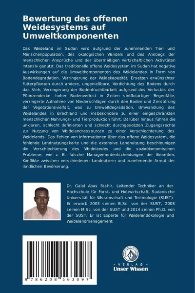 Das Weideland im Sudan wird aufgrund der zunehmenden Tier- und Menschenpopulation, des ökologischen Wandels und des Anstiegs der menschlichen Ansprüche und der übermäßigen wirtschaftlichen Aktivitäten intensiv genutzt. Das traditionelle offene Weidesystem im Sudan hat negative Auswirkungen auf die Umweltkomponenten des Weidelandes in Form von Bodendegradation, Verringerung der Weidekapazität, Ersetzen erwünschter Futterpflanzen durch andere, ungenießbare, Verdichtung des Bodens durch das Vieh, Verringerung der Bodenfruchtbarkeit aufgrund des Verlustes der Pflanzendecke, hoher Bodenverlust in Zeiten sintflutartiger Regenfälle, verringerte Aufnahme von Niederschlägen durch den Boden und Zerstörung der Vegetationsvielfalt, was zu Umweltdegradation, Umwandlung des Weidelandes in Brachland und insbesondere zu einer eingeschränkten menschlichen Nahrungs- und Tierproduktion führt. Darüber hinaus führen die unklaren, schlecht definierten und schlecht durchgesetzten Zugangsrechte zur Nutzung von Weidelandressourcen zu einer Verschlechterung des Weidelands. Das Fehlen von Informationen über das offene Weidesystem, die fehlende Landnutzungskarte und die extensive Landnutzung beschleunigen die Verschlechterung des Weidelandes und die sozioökonomischen Probleme, wie z. B. falsche Managemententscheidungen der Beamten, Konflikte zwischen verschiedenen Landnutzern und zunehmende Armut der ländlichen Bevölkerung.