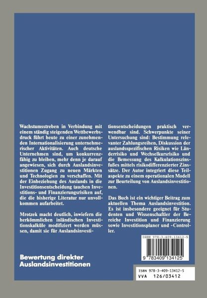 Die deutsche betriebswirtschaftliche Literatur hat sich mit den besonderen Problemen international tiitiger Konzerne lange Zeit wenig beschliftigt. Trotz einer in den letzten Jahren verstiirkten Erfassung und Beschreibung der Entscheidungsprobleme mangelt es in Teilbereichen an umfassenden Losungs anslitzen. Zu den offenen Problemen des internationalen Finanzmanagements als Teilgebiet einer internationalen Betriebswirtschaftslehre gehoren Investi tions- und Finanzierungsfragen, die aufgrund stlindig zunehmender Kapital verflechtungen deutscher Unternehmen mit dem Ausland an Bedeutung gewonnen haben. Dies spiegelt die Aktualitiit und Praxisrelevanz dieser auf einer Bochumer Dissertation basierenden Arbeit wider. Mit der Ausdehnung der Inve stitionsentscheidung auf das Ausland treten zuslitzliche EinfluBfaktoren auf, die eine Modifizierung inllindischer Investitionskalkiile erfordern. Auch in der anglo-amerikanischen Literatur ist die Problematik einzelwirtschaft licher Investitionskalkiile flir Direktinvestitionen trotz intensiver Diskussion zahlreicher Einzelprobleme kaum urnfassend dargestellt. Der Verfasser hat sich daher zum Ziel gesetzt, unter Diskussion und in Erweiterung bisheriger the ore tischer Uberlegungen ein moglichst umfassendes, zugleich aber praktikables Investitionskalkiil zu entwickeln. Er setzt sich demzufolge mit den bewertungs relevanten Zahlungsreihen, dem Wechselkursrisiko, der Bewertung des Llinder risikos sowie der Wahl des adliquaten KalkulationszinsfuBes kritisch auseinander.