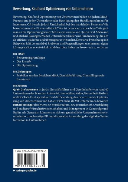Bewertung, Kauf und Optimierung von Unternehmen bilden bei jedem M&A-Prozess und jeder Übernahme oder Beteiligung den Handlungsrahmen für Investoren. Oft besteht jedoch Unsicherheit bei den handelnden Personen: Wie bewertet man eine Firma realistisch? Was ist beim Kauf zu beachten? Wie geht man an die Optimierung heran? Mit diesem essential von Quirin Graf Adelmann und Michael Rassinger erhalten Unternehmenskäufer eine Handreichung, die sich als effizient, skalierbar und übertragbar erwiesen hat. Der starke Praxisbezug mit Beispielen hilft Lesern dabei, Probleme und Fragestellungen zu erkennen, eigene Lösungsansätze zu entwickeln und den roten Faden im Prozess nie zu verlieren.