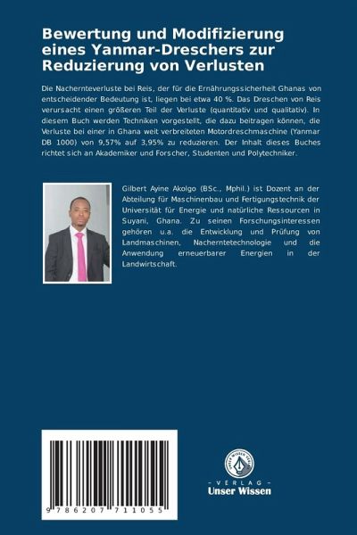 Die Nachernteverluste bei Reis, der für die Ernährungssicherheit Ghanas von entscheidender Bedeutung ist, liegen bei etwa 40 %. Das Dreschen von Reis verursacht einen größeren Teil der Verluste (quantitativ und qualitativ). In diesem Buch werden Techniken vorgestellt, die dazu beitragen können, die Verluste bei einer in Ghana weit verbreiteten Motordreschmaschine (Yanmar DB 1000) von 9,57% auf 3,95% zu reduzieren. Der Inhalt dieses Buches richtet sich an Akademiker und Forscher, Studenten und Polytechniker.