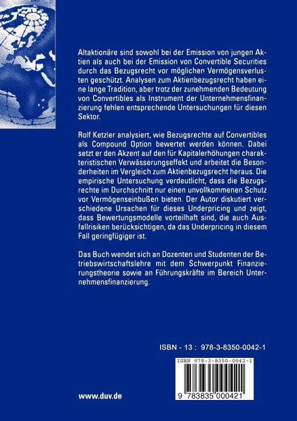 Rolf Ketzler analysiert, wie Bezugsrechte auf Convertibles als Compound Option bewertet werden können. Dabei setzt er den Akzent auf den für Kapitalerhöhungen charakteristischen Verwässerungseffekt und arbeitet die Besonderheiten im Vergleich zum Aktienbezugsrecht heraus. Die empirische Untersuchung verdeutlicht, dass die Bezugsrechte im Durchschnitt nur einen unvollkommenen Schutz vor Vermögenseinbußen bieten. Der Autor diskutiert verschiedene Ursachen für dieses Underpricing und zeigt, dass Bewertungsmodelle vorteilhaft sind, die auch Ausfallrisiken berücksichtigen, da das Underpricing in diesem Fall geringfügiger ist.