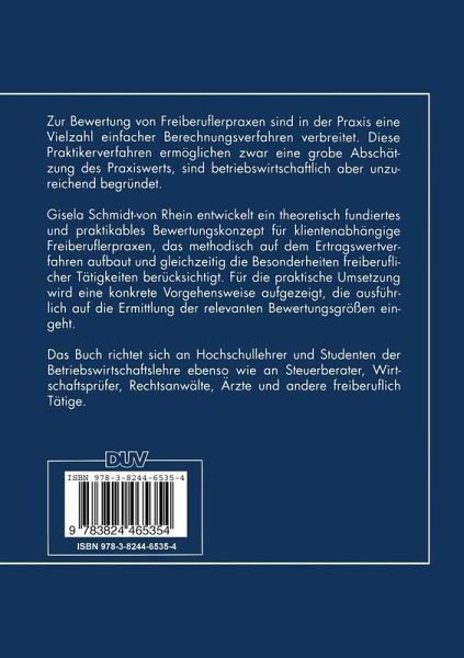 Zur Bewertung von Freiberuflerpraxen sind in der Praxis eine Vielzahl einfacher Berechnungsverfahren verbreitet. Diese Praktikerverfahren ermöglichen zwar eine grobe Abschätzung des Praxiswerts, sind betriebswirtschaftlich aber unzureichend begründet. Gisela Schmidt-von Rhein entwickelt ein theoretisch fundiertes und praktikables Bewertungskonzept für klientenabhängige Freiberuflerpraxen, das methodisch auf dem Ertragswertverfahren aufbaut und gleichzeitig die Besonderheiten freiberuflicher Tätigkeiten berücksichtigt. Für die praktische Umsetzung wird eine konkrete Vorgehensweise aufgezeigt, die ausführlich auf die Ermittlung der relevanten Bewertungsgrößen eingeht.
