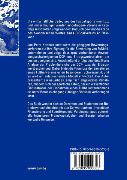 Jan Peter Korthals untersucht die gängigen Bewertungsverfahren auf ihre Eignung für die Bewertung von Fußballunternehmen und zeigt, dass trotz vorhandener Anwendungsschwierigkeiten DCF- und Ertragswertverfahren am besten geeignet sind. Anschließend erfolgt eine detaillierte Analyse der Problembereiche der DCF- bzw. der Ertragswertbestimmung. Dabei bildet die Prognose der Einnahmen eines Fußballvereins einen besonderen Schwerpunkt, und es wird ein entsprechendes Modell entwickelt. Der Autor präsentiert ein neuartiges, empirisch abgeleitetes Verfahren, mit dem sich der sportliche Erfolg, der ein wesentlicher Einflussfaktor der Einnahmen eines Fußballunternehmens ist, unter Berücksichtigung zufälliger Einflüsse vorhersagen lässt.