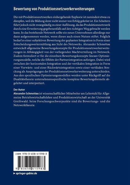 Die mit Produktionsnetzwerken einhergehende Euphorie ist zumindest etwas zu dämpfen, weil die Bildung derer nicht immer von Erfolg gekrönt ist. Ein Scheitern führt jedoch nicht zwangsläufig zu einer Auflösung, da das Produktionsnetzwerk durch eine Erweiterung gegebenenfalls auf den richtigen Weg gebracht werden kann. In das bestehende Netzwerk sollte ein neues Unternehmen allerdings nur dann aufgenommen werden, wenn dieses auch einen Nutzen stiftet. Folglich bedarf es einer subjektiven Bewertung der geplanten Integration in Form einer Entscheidungswertermittlung aus Sicht des Netzwerks. Alexander Schmettau entwickelt allgemeine Bewertungskonzepte für Produktionsnetzwerkerweiterungen in Abhängigkeit von der vorliegenden Machtverteilung im Netzwerk. Zudem formuliert er für die einzelnen Bewertungskonzepte lineare Optimierungsmodelle, welche die Effekte der Partnerintegration aufzeigen. Dabei wird zwischen der horizontalen Integration und der vertikalen Integration in Form einer Vorwärts- und einer Rückwärtsintegration sowie einer vertikalen Streckung als Ausprägungen der Produktionsnetzwerkerweiterung unterschieden. Aus den spezifischen Optimierungsmodellen werden unter Rückgriff auf die Dualitätstheorie unternehmensspezifische komplexe Bewertungsformeln abgeleitet und interpretiert.