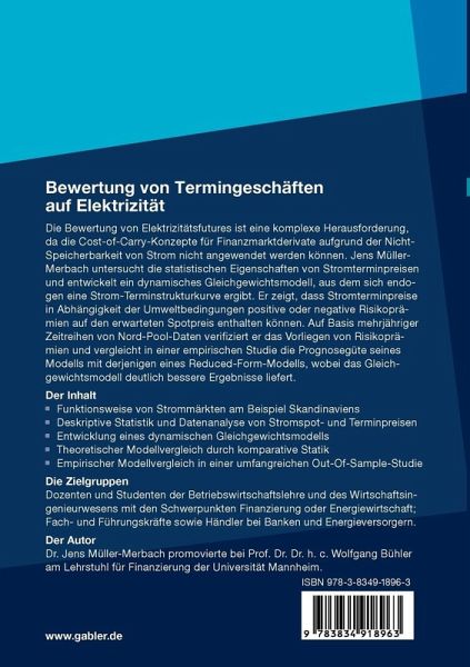 Die Bewertung von Elektrizitätsfutures ist eine komplexe Herausforderung, da die Cost-of-Carry-Konzepte aufgrund der Nicht-Speicherbarkeit von Strom für Finanzmarktderivate nicht anwendbar sind. Jens Müller-Merbach untersucht die statistischen Eigenschaften von Stromterminpreisen und entwickelt ein dynamisches Gleichgewichtsmodell, aus dem sich endogen eine Strom-Terminstrukturkurve ergibt. Er zeigt, dass Stromterminpreise in Abhängigkeit der Umweltbedingungen positive oder negative Risikoprämien auf den erwarteten Spotpreis enthalten können. Auf Basis mehrjähriger Zeitreihen von Nord-Pool-Daten verifiziert er das Vorliegen von Risikoprämien und vergleicht in einer empirischen Studie die Prognosegüte seines Modells mit derjenigen eines Reduced-Form-Modells, wobei das Gleichgewichtsmodell deutlich bessere Ergebnisse liefert.