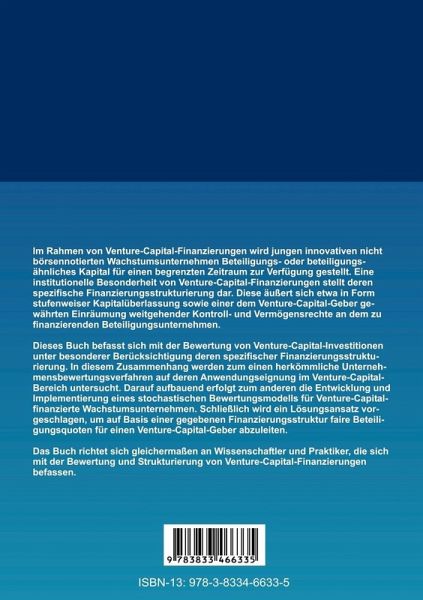 Im Rahmen von Venture-Capital-Finanzierungen wird jungen innovativen nicht börsennotierten Wachstumsunternehmen Beteiligungs- oder beteiligungsähnliches Kapital für einen begrenzten Zeitraum zur Verfügung gestellt. Eine institutionelle Besonderheit von Venture-Capital-Finanzierungen stellt deren spezifische Finanzierungsstrukturierung dar. Diese äußert sich etwa in Form stufenweiser Kapitalüberlassung sowie einer dem Venture-Capital-Geber gewährten Einräumung weitgehender Kontroll- und Vermögensrechte an dem zu finanzierenden Beteiligungsunternehmen.Dieses Buch befasst sich mit der Bewertung von Venture-Capital-Investitionen unter besonderer Berücksichtigung deren spezifischer Finanzierungsstrukturierung. In diesem Zusammenhang werden zum einen herkömmliche Unternehmensbewertungsverfahren auf deren Anwendungseignung im Venture-Capital-Bereich untersucht. Darauf aufbauend er-folgt zum anderen die Entwicklung und Implementierung eines stochastischen Bewer-tungsmodells für Venture-Capital-finanzierte Wachstumsunternehmen. Schließlich wird ein Lösungsansatz vorgeschlagen, um auf Basis einer gegebenen Finanzierungsstruktur faire Beteiligungsquoten für einen Venture-Capital-Geber abzuleiten.Das Buch richtet sich gleichermaßen an Wissenschaftler und Praktiker, die sich mit der Bewertung und Strukturierung von Venture-Capital-Finanzierungen befassen.