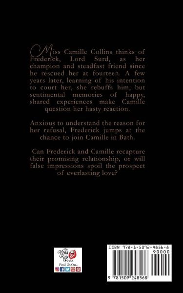 Miss Camille Collins thinks of Frederick, Lord Surd, as her champion and steadfast friend since he rescued her at fourteen. A few years later, learning of his intention to court her, she rebuffs him, but sentimental memories of happy, shared experiences make Camille question her hasty reaction. Anxious to understand the reason for her refusal, Frederick jumps at the chance to join Camille in Bath. Can Frederick and Camille recapture their promising relationship, or will false impressions spoil the prospect of everlasting love?