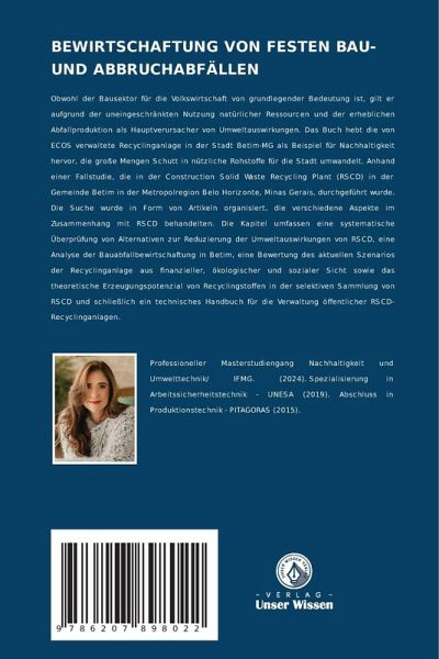 Obwohl der Bausektor für die Volkswirtschaft von grundlegender Bedeutung ist, gilt er aufgrund der uneingeschränkten Nutzung natürlicher Ressourcen und der erheblichen Abfallproduktion als Hauptverursacher von Umweltauswirkungen. Das Buch hebt die von ECOS verwaltete Recyclinganlage in der Stadt Betim-MG als Beispiel für Nachhaltigkeit hervor, die große Mengen Schutt in nützliche Rohstoffe für die Stadt umwandelt. Anhand einer Fallstudie, die in der Construction Solid Waste Recycling Plant (RSCD) in der Gemeinde Betim in der Metropolregion Belo Horizonte, Minas Gerais, durchgeführt wurde. Die Suche wurde in Form von Artikeln organisiert, die verschiedene Aspekte im Zusammenhang mit RSCD behandelten. Die Kapitel umfassen eine systematische Überprüfung von Alternativen zur Reduzierung der Umweltauswirkungen von RSCD, eine Analyse der Bauabfallbewirtschaftung in Betim, eine Bewertung des aktuellen Szenarios der Recyclinganlage aus finanzieller, ökologischer und sozialer Sicht sowie das theoretische Erzeugungspotenzial von Recyclingstoffen in der selektiven Sammlung von RSCD und schließlich ein technisches Handbuch für die Verwaltung öffentlicher RSCD-Recyclinganlagen.