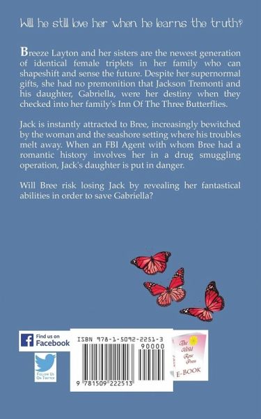Breeze Layton and her sisters are the newest generation of identical female triplets in her family who can shapeshift and sense the future. Despite her supernormal gifts, she had no premonition that Jackson Tremonti and his daughter, Gabriella, were her destiny when they checked into her family's Inn Of The Three Butterflies. Jack is instantly attracted to Bree, increasingly bewitched by the woman and the seashore setting where his troubles melt away. When an FBI Agent with whom Bree had a romantic history involves her in a drug smuggling operation, Jack's daughter is put in danger. Will Bree risk losing Jack by revealing her fantastical abilities in order to save Gabriella?
