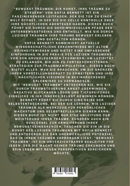 "Bewusst Träumen: Die Kunst, Ihre Träume zu steuern" von Sofia Bennett ist ein faszinierender Leitfaden, der die Tür zu einer Welt öffnet, in der Sie die volle Kontrolle über Ihre nächtlichen Abenteuer haben. Dieses Buch führt Sie durch die geheimnisvollen Pfade des Unterbewusstseins und enthüllt, wie Sie durch luzides Träumen Ihre Träume bewusst erleben und gestalten können.Sofia Bennett kombiniert aktuelle wissenschaftliche Erkenntnisse mit altem Weisheitswissen und bietet eine umfassende Einführung in die Praxis des luziden Träumens. Von den grundlegenden Techniken, um Luzidität zu erlangen, bis hin zu fortgeschrittenen Strategien zur Traummanipulation - dieses Buch bietet alles, was Sie brauchen, um die Grenzen Ihrer Vorstellungskraft zu erweitern und Ihre nächtlichen Visionen in beeindruckende Erlebnisse zu verwandeln.Mit "Bewusst Träumen" entdecken Sie, wie Sie durch Traumsteuerung Angst überwinden, kreative Blockaden lösen und tiefgreifende Einblicke in Ihr inneres Selbst gewinnen können. Bennett führt Sie durch eine Reise der Selbstentdeckung, bei der Sie lernen, wie luzides Träumen als Werkzeug für persönliches Wachstum und Selbstreflexion dienen kann.Dieses Buch ist nicht nur eine Anleitung zur Meisterung Ihrer Träume, sondern auch ein Schlüssel zur Erweiterung Ihrer Bewusstseinsgrenzen. Tauchen Sie ein in die Kunst des luziden Träumens mit Sofia Bennett und entdecken Sie das unermessliche Potenzial, das in Ihren Träumen verborgen liegt. "Bewusst Träumen" ist ein unverzichtbarer Begleiter für jeden, der die Macht seiner Träume erkunden und sein Leben mit neuen Perspektiven bereichern möchte.