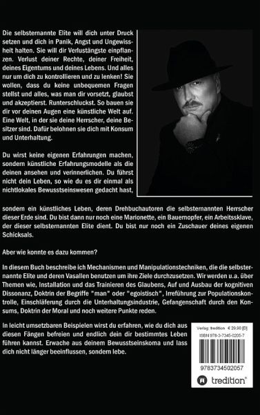 In diesem Buch beschreibe ich Mechanismen und Manipulationstechniken, die die selbsternannte Elite und deren Vasallen benutzen um ihre Ziele durchzusetzen. Wir werden u.a. über Themen wie, Installation und das Trainieren des Glaubens, Auf und Ausbau der kognitiven Dissonanz, Doktrin der Begriffe "man" oder "egoistisch", Irreführung zur Populationskontrolle, Einschläferung durch die Unterhaltungsindustrie, Gefangenschaft durch den Konsums, Doktrin der Moral und noch weitere Punkte reden.