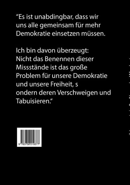 Es ist unabdingbar, dass wir uns alle gemeinsam für mehr Demokratie einsetzen müssen. Ich bin davon überzeugt: Nicht das Benennen dieser Missstände ist das große Problem für unsere Demokratie und unsere Freiheit, sondern deren Verschweigen und Tabuisieren. Allerdings ist es nahezu unmöglich geworden, Kritik zu äußern, ohne entsprechend massiv in das dazugehörige Framing seitens der Medien und der Politik zu geraten.