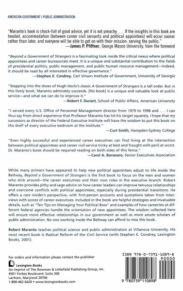 With rare exceptions, few large institutions change bosses every two or three years. Yet the U.S. Government has temps on top. American government has 3,000 presidential political appointees and thousands more state and local political appointees, who refer to their in-and-out bosses as "Christmas help." Beyond a Government of Strangers is the first book to focus on the men and women who stick around, on the career executives and their own roles in the executive branch. Robert Maranto provides pithy, sage advice on how career bureaucrats can improve tenuous relationships and overcome conflicts with political appointees, especially during presidential transitions, for more effective government from the top down.