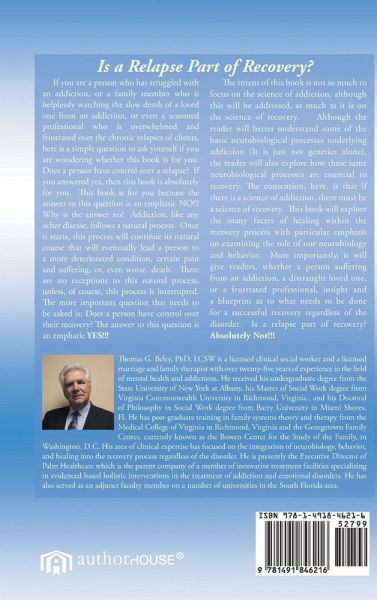 If you are a person who has struggled with an addiction, or a family member who is helplessly watching the slow death of a loved one from an addiction, or even a seasoned professional who is overwhelmed and frustrated over the chronic relapses of clients, here is a simple question to ask yourself if you are wondering whether this book is for you. Does a person have control over a relapse? If you answered yes, then this book is absolutely for you. This book is for you because the answer to this question is an emphatic NO!!! Why is the answer no? Addiction, like any other disease, follows a natural process. Once it starts, this process will continue its natural course that will eventually lead a person to a more deteriorated condition, certain pain and suffering, or, even worse, death. There are no exceptions to this natural process, unless, of course, this process is interrupted. The more important question that needs to be asked is: Does a person have control over their recovery? The answer to this question is an emphatic YES!!! The intent of this book is not so much to focus on the science of addiction, although this will be addressed, as much as it is on the science of recovery. Although the reader will better understand some of the basic neurobiological processes underlying addiction (It is just not genetics alone), the reader will also explore how these same neurobiological processes are essential to recovery. The contention, here, is that if there is a science of addiction, there must be a science of recovery. This book will explore the many facets of healing within the recovery process with particular emphasis on examining the role of our neurobiology and behavior. More importantly, it will give readers, whether a person suffering from an addiction, a distraught loved one, or a frustrated professional, insight and a blueprint as to what needs to be done for a successful recovery regardless of the disorder. Is relapse a part of recovery? Absolutely Not!!!