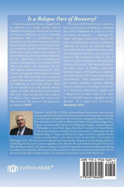 If you are a person who has struggled with an addiction, or a family member who is helplessly watching the slow death of a loved one from an addiction, or even a seasoned professional who is overwhelmed and frustrated over the chronic relapses of clients, here is a simple question to ask yourself if you are wondering whether this book is for you. Does a person have control over a relapse? If you answered yes, then this book is absolutely for you. This book is for you because the answer to this question is an emphatic NO!!! Why is the answer no? Addiction, like any other disease, follows a natural process. Once it starts, this process will continue its natural course that will eventually lead a person to a more deteriorated condition, certain pain and suffering, or, even worse, death. There are no exceptions to this natural process, unless, of course, this process is interrupted. The more important question that needs to be asked is: Does a person have control over their recovery? The answer to this question is an emphatic YES!!! The intent of this book is not so much to focus on the science of addiction, although this will be addressed, as much as it is on the science of recovery. Although the reader will better understand some of the basic neurobiological processes underlying addiction (It is just not genetics alone), the reader will also explore how these same neurobiological processes are essential to recovery. The contention, here, is that if there is a science of addiction, there must be a science of recovery. This book will explore the many facets of healing within the recovery process with particular emphasis on examining the role of our neurobiology and behavior. More importantly, it will give readers, whether a person suffering from an addiction, a distraught loved one, or a frustrated professional, insight and a blueprint as to what needs to be done for a successful recovery regardless of the disorder. Is relapse a part of recovery? Absolutely Not!!!