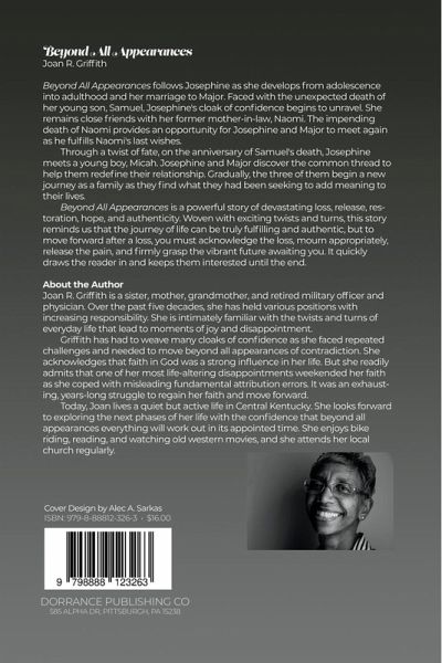 About the Book Beyond All Appearances follows Josephine as she develops from adolescence into adulthood and her marriage to Major. Faced with the unexpected death of her young son, Samuel, Josephine's cloak of confidence begins to unravel. She remains close friends with her former mother-in-law, Naomi. The impending death of Naomi provides an opportunity for Josephine and Major to meet again as he fulfills Naomi's last wishes. Through a twist of fate, on the anniversary of Samuel's death, Josephine meets a young boy, Micah. Josephine and Major discover the common thread to help them redefine their relationship. Gradually, the three of them begin a new journey as a family as they find what they had been seeking to add meaning to their lives. Beyond All Appearances is a powerful story of devastating loss, release, restoration, hope, and authenticity. Woven with exciting twists and turns, this story reminds us that the journey of life can be truly fulfilling and authentic, but to move forward after a loss, you must acknowledge the loss, mourn appropriately, release the pain, and firmly grasp the vibrant future awaiting you. It quickly draws the reader in and keeps them interested until the end. About the Author Joan R. Griffith is a sister, mother, grandmother, and retired military officer and physician. Over the past five decades, she has held various positions with increasing responsibility. She is intimately familiar with the twists and turns of everyday life that lead to moments of joy and disappointment. Griffith has had to weave many cloaks of confidence as she faced repeated challenges and needed to move beyond all appearances of contradiction. She acknowledges that faith in God was a strong influence in her life. But she readily admits that one of her most life-altering disappointments weekended her faith as she coped with misleading fundamental attribution errors. It was an exhausting, years-long struggle to regain her faith and move forward. Today, Joan lives a quiet but active life in Central Kentucky. She looks forward to exploring the next phases of her life with the confidence that beyond all appearances everything will work out in its appointed time. She enjoys bike riding, reading, and watching old western movies, and she attends her local church regularly.