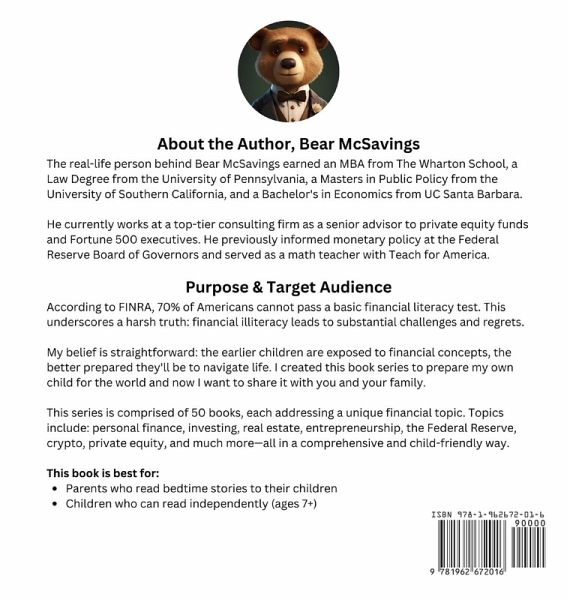 About this Book: Join Lilly on a fascinating journey as she uncovers the diverse ways adults earn their income, from the bustling ambiance of office spaces to the fervor of passionate side hustles. This enlightening tale is perfect for children eager to understand the concept of money and the multitude of avenues through which it can be earned. About the Author: The real-life person behind Bear McSavings earned an MBA from The Wharton School, a Law Degree from the University of Pennsylvania, a Masters in Public Policy from the University of Southern California, and a Bachelor's in Economics from UC Santa Barbara. He currently works at a top-tier consulting firm as a senior advisor to private equity funds and Fortune 500 executives. He previously informed monetary policy at the Federal Reserve Board of Governors and served as a math teacher with Teach for America. About the Bear McSavings Series: The Bear McSavings Series is a children's financial literacy series comprised of 50 books, each addressing a unique financial topic. Topics include: personal finance, investing, real estate, entrepreneurship, the Federal Reserve, crypto, private equity, and much more-all in a comprehensive and child-friendly way. According to FINRA, 70% of Americans cannot pass a basic financial literacy test. This underscores a harsh truth: financial illiteracy leads to substantial challenges and regrets. My belief is straightforward: the earlier children are exposed to financial concepts, the better prepared they'll be to navigate life. I created this book series to prepare my own child for the world and now I want to share it with you and your family.