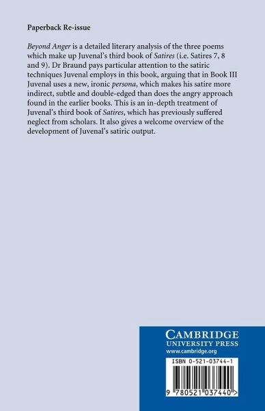 Beyond Anger is a detailed literary analysis of the three poems which make up Juvenal's third book of Satires (i.e. Satires 7, 8 and 9). Dr Braund pays particular attention to the satiric techniques Juvenal employs in this book, arguing that in Book III Juvenal uses a new, ironic persona, which makes his satire more indirect, subtle and double-edged than does the angry approach found in the earlier books. This is an in-depth treatment of Juvenal's third book of Satires, which has previously suffered neglect from scholars. It also gives a welcome overview of the development of Juvenal's satiric output.