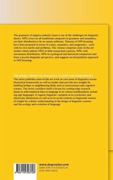 The grammar of negative polarity items is one of the challenges for linguistic theory. NPIs cross-cut all traditional categories in grammar and semantics, yet their distribution is by no means arbitrary. Theories of NPI licensing have been proposed in terms of syntax, semantics, and pragmatics - each with its own merits and problems. The volume comprises state-of-the-art studies and suggests an interpolation approach to NPI licensing.