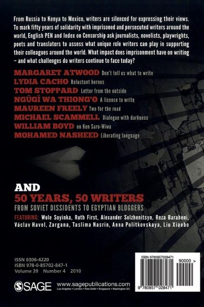 This issue of Index on Censorship celebrates 50 years of English PEN by looking at the impact that imprisonment and persecution has on literature -- and asking what challenges writers continue to face today. Contributors include Margaret Atwood, Lydia Cacho and Maureen Freel
