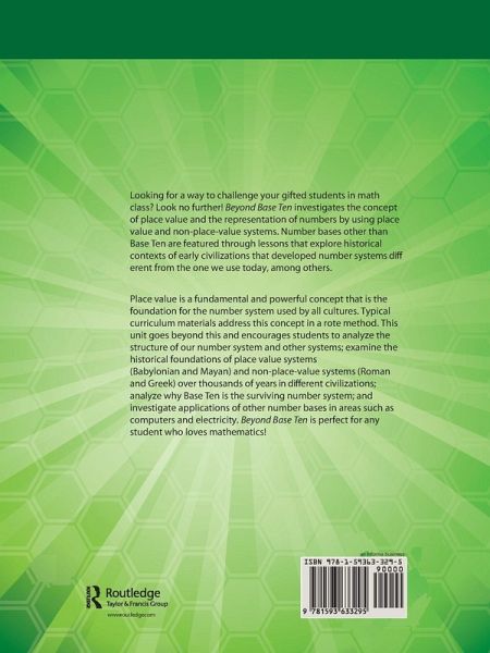 Looking for a way to challenge your gifted students in math class? Look no further! Beyond Base Ten investigates the concept of place value and the representation of numbers by using place value and non-place-value systems. Number bases other than Base Ten are featured, especially through historical contexts of early civilizations that developed number systems different from the one we use today. Place value is a fundamental and powerful concept that is the foundation for the number system used by all cultures. Typical curriculum materials address this concept in a rote method. This unit goes beyond this and encourages students to analyze the structure of our number system and other systems; examine the historical foundations of place value systems (Babylonian and Mayan) and non-place-value systems (Roman and Greek) over thousands of years in different civilizations; analyze why Base Ten is the surviving number system; and investigate applications of other number bases in areas such as computers and electricity. Beyond Base Ten is perfect for any student who loves mathematics! Beyond Base Ten was developed by the Center for Gifted Education at The College of William and Mary. Grades 3-6