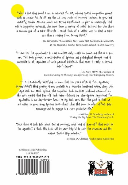 This is the 10th anniversary 3rd printing of Beyond Belief, first published 2013, now with a new Preface and updated content/links. Finally, a daily reflection book for everyone; Rebellion Dogs Publishing offers Beyond Belief: Agnostic Musings for 12 Step Life, the first secular daily reflection book written in a contemporary language for today's addicts and alcoholics in recovery. Nothing is sacred and nothing is forbidden; we draw from classic and contemporary 12-Step and the broader peer-to-peer recovery wisdom, Beyond Belief explores philosophy, psychology, entertainment, art, spirituality, skeptical inquiry and the uncanny wisdom of people in recovery from addiction and mental health. Available from Rebellion Dogs Publishing website and your favorite online or brick-and-mortar retailer in eBook, paperback AND NOW, Hard Cover, Beyond Belief is not anti-religious, but candidly secular (non-religious). In a new era of recovery, this book has becoming a "go-to" for online and in-person groups and for individual reflection. Ernie Kurtz, PhD from The Forward, "The book is aimed at a general 12-Step readership, but it is mindful that there heretofore exist no such aids for unbelievers, freethinkers, and the unconventionally spiritual. Given that the latest Pew Research survey found that twenty percent of the American people list their religious affiliation as 'None, ' it is certainly time that the Recovery world took into consideration this population's needs. Beyond Belief addresses that need in a confident, non-aggressive way. I doubt that any believer will find anything objectionable in its pages. This believer, for one, finds much that is spiritually helpful."