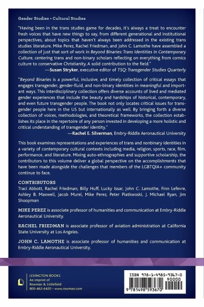 A 2022 Choice Reviews Outstanding Academic Title This books examines representations and experiences of trans and nonbinary identities in a variety of contemporary cultural contexts including media, religion, sports, race, film, performance, and literature. Mixing auto-ethnographies and supportive scholarship, the contributors to this volume deliver a global perspective on the accomplishment that have been made alongside the challenges that members of the LGTBQIA+ community continue to face.