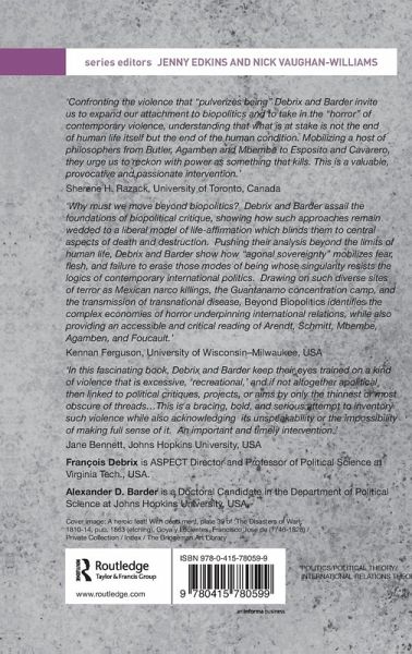 'Beyond Biopolitics constitutes a truly serious attempt to think about the unthinkable.' Guy Lancaster, Political Studies Review: 2014 VOL 12, 93. Beyond Biopolitics exposes the conceptual limits of critical biopolitical approaches to violence, war, and terror in the post-9/11-War on Terror era. This volume shows that such popular international political theories rely upon frames of representation that leave out of focus a series of extreme forms of gruesome violence that have no concern for the preservation of life, a crucial biopolitical theme. Debrix and Barder mobilize different concepts-horror, agonal sovereignty, the pulverization of the flesh, or the notion of an inhumanity-to-come-to shed light on past and present ghastly scenes and events of violence that seek to undo the very idea of humanity. To highlight the capacity of horror to be in excess of both violence and the meaning of humanity, Beyond Biopolitics provides a series of engagements with issues much debated in contemporary critical theoretical circles, in particular war and terror, the production of fear, states and spaces of exception, and alterity as enmity. This work will be of great interest to scholars of critical international relations theory, critical security studies and international relations.