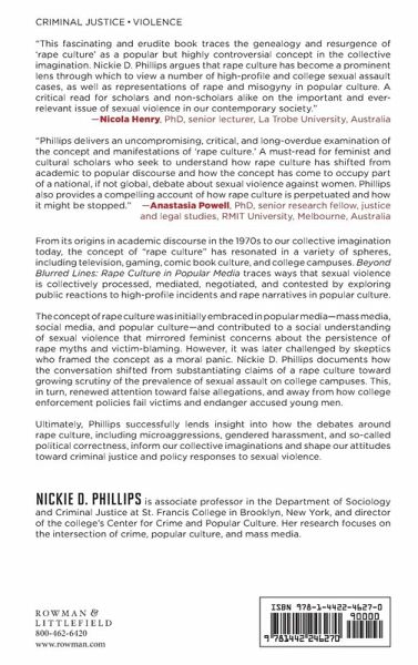 From its origins in academic discourse in the 1970s to our collective imagination today, the concept of "rape culture" has resonated in a variety of spheres, including television, gaming, comic book culture, and college campuses. Beyond Blurred Lines traces ways that sexual violence is collectively processed, mediated, negotiated, and contested by exploring public reactions to high-profile incidents and rape narratives in popular culture. The concept of rape culture was initially embraced in popular media - mass media, social media, and popular culture - and contributed to a social understanding of sexual violence that mirrored feminist concerns about the persistence of rape myths and victim-blaming. However, it was later challenged by skeptics who framed the concept as a moral panic. Nickie D. Phillips documents how the conversation shifted from substantiating claims of a rape culture toward growing scrutiny of the prevalence of sexual assault on college campuses. This, in turn, renewed attention toward false allegations, and away from how college enforcement policies fail victims to how they endanger accused young men. Ultimately, she successfully lends insight into how the debates around rape culture, including microaggressions, gendered harassment and so-called political correctness, inform our collective imaginations and shape our attitudes toward criminal justice and policy responses to sexual violence.