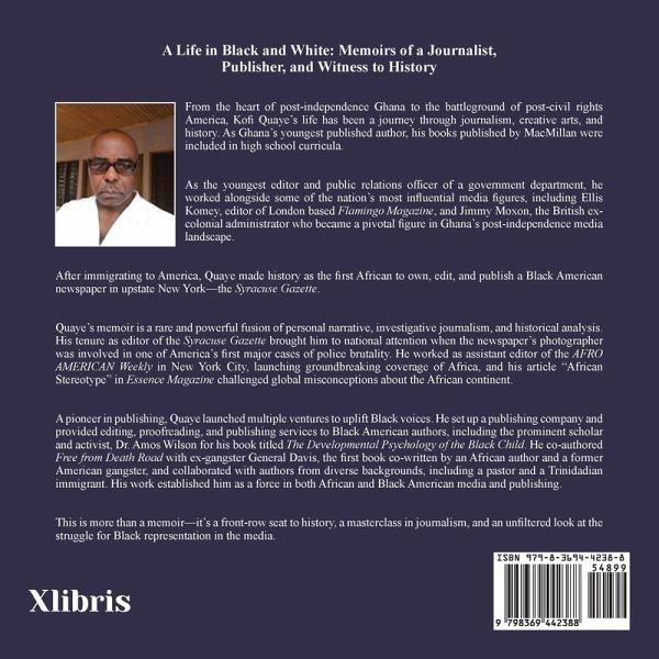 A Life in Black and White: Memoirs of a Journalist, Publisher, and Witness to History From the heart of post-independence Ghana to the battleground of post-civil rights America, Kofi Quaye's life has been a journey through journalism, creative arts, and history. As Ghana's youngest published author, his books published by MacMillan were included in high school curricula. As the youngest editor and public relations officer of a government department, he worked alongside some of the nation's most influential media figures, including Ellis Komey, editor of London based Flamingo Magazine, and Jimmy Moxon, the British ex-colonial administrator who became a pivotal figure in Ghana's post-independence media landscape. After immigrating to America, Quaye made history as the first African to own, edit, and publish a Black American newspaper in upstate New York-the Syracuse Gazette. Quaye's memoir is a rare and powerful fusion of personal narrative, investigative journalism, and historical analysis. His tenure as editor of the Syracuse Gazette brought him to national attention when the newspaper's photographer was involved in one of America's first major cases of police brutality. He worked as assistant editor of the AFRO AMERICAN Weekly in New York City, launching groundbreaking coverage of Africa, and his article "African Stereotype" in Essence Magazine challenged global misconceptions about the African continent. A pioneer in publishing, Quaye launched multiple ventures to uplift Black voices. He set up a publishing company and provided editing, proofreading, and publishing services to Black American authors, including the prominent scholar and activist, Dr. Amos Wilson for his book titled The Developmental Psychology of the Black Child. He co-authored Free from Death Road with ex-gangster General Davis, the first book co-written by an African author and a former American gangster, and collaborated with authors from diverse backgrounds, including a pastor and a Trinidadian immigrant. His work established him as a force in both African and Black American media and publishing. This is more than a memoir-it's a front-row seat to history, a masterclass in journalism, and an unfiltered look at the struggle for Black representation in the media.