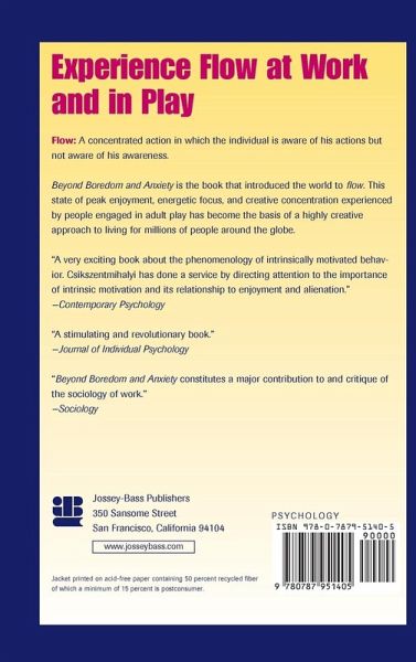 " . . . they concentrate their attention on a limited stimulus field, forget personal problems, lose their sense of time and of themselves, feel competent and in control, and have a sense of harmony and union with their surroundings . . . they cease to worry about whether the activity will be productive or whether it will be rewarded . . . they have entered a state of flow."--Mihaly Csikszentmihalyi In a world organized around the assumption that 'serious' work should be grim and unpleasant, we strive to make our lives more meaningful. Whether a line worker or a paper pusher, we find ourselves on a never-ending search for ways to counteract the boredom, anxiety, and alienation that our work-oriented society has become. But in this culture ruled by the pursuit of money, prestige, and pleasure, there are some individuals willing to give up material awards for the elusive experience of mere enjoyment. These are the rock-climbers, the dancers, the chess masters, and others who have sacrificed all for the power of play-these are the individuals who have entered the 'state of flow'. Now in a special 25th anniversary edition and filled with brilliant wisdom and insights, Beyond Boredom and Anxiety offers a timeless introduction to the concept of flow and the scientific basis behind it-all through the work of one of the field's great scientists, Mihaly Csikzentmihalyi. Through real-life examples, discover how enjoyable activities provide a common experience-a satisfying, often exhilarating, feeling of creative accomplishment and heightened functioning-and under what conditions 'serious' work can also provide this intrinsic enjoyment. For all of us who seek to recognize, understand, and apply this powerful motivational force, Beyond Boredom and Anxiety is a compelling look at the origins of flow and how its use can transform our lives. [back jacket] Experience Flow at Work and in Play Flow: A concentrated action in which the individual is aware of his actions but not aware of his awareness. Beyond Boredom and Anxiety is the book that introduced the world to flow. This state of peak enjoyment, energetic focus, and creative concentration experienced by people engaged in 'adult play', has become the basis of a highly creative approach to living for millions of people around the globe. "A very exciting book about the phenomenology of intrinsically motivated behavior. Csikszentmihalyi has done a service by directing attention to the importance of intrinsic motivation and its relationship to enjoyment and alienation."--Contemporary Psychology "A stimulating and revolutionary book."--Journal of Individual Psychology "Beyond Boredom and Anxiety constitutes a major contribution to and critique of the sociology of work."--Sociology