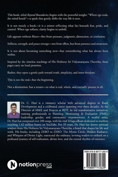 This book, titled Beyond Boundaries, begins with the powerful insight: "Where ego ends, the mind bends"-a spark that gently shifts the way life is seen. It is not merely a book-it is a mirror reflecting what lies beneath fear, pride, and control. When ego softens, clarity begins to unfold. Life appears without filters-free from pressure, judgment, distraction, or confusion. Stillness, strength, and peace emerge-not from effort, but from presence and awareness. It is not about becoming something new-but remembering what has always been within. Inspired by the timeless teachings of His Holiness Sri Vidyanarayana Theertha, these pages carry no loud promises. Rather, they open a gentle path toward truth, simplicity, and inner freedom. This is not the end-but the beginning. Not a destination, but a return-to what is real, whole, and eternally present in all.