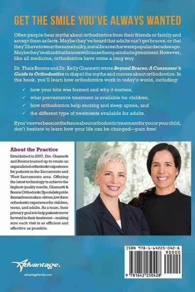 Get The Smile You've Always Wanted Often people hear myths about orthodontics from their friends or family and accept them as facts. Maybe they've heard that adults can't get braces, or that they'll have to wear the same bulky, metal braces that were popular decades ago. Maybe they're afraid that braces will cause them pain during treatment. However, like all medicine, orthodontics have come a long way. Dr. Thais Booms and Dr. Kelly Giannetti wrote Beyond Braces: A Consumer's Guide to Orthodontics to dispel the myths and rumors about orthodontics. In this book, you'll learn how everything about how orthodontics work in today's world, including: -how your bite was formed and why it matters, -what preventative treatment is available for children, -how orthodontics help snoring and sleep apnea, and -the different type of treatments available for adults. If you've ever been on the fence about orthodontic treatment for you or your child, don't hesitate to learn how your life can be changed--pain free!
