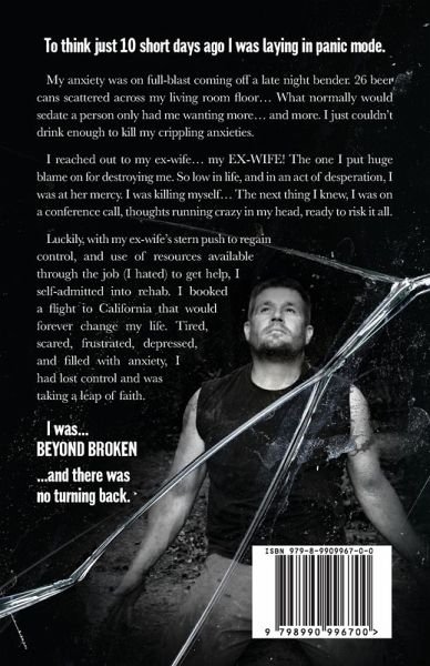 My anxiety was on full-blast coming off a late-night bender. 26 beer cans scattered across my living room floor... What normally would sedate a person only had me wanting more... and more. I just couldn't drink enough to kill my crippling anxieties. I reached out to my ex-wife... my EX-WIFE! The one I put huge blame on for destroying me. So low in life, and in an act of desperation, I was at her mercy. I was killing myself... The next thing I knew, I was on a conference call, thoughts running crazy in my head, ready to risk it all. Luckily, with my ex-wife's stern push to regain control, and use of resources available through the job (I hated) to get help, I self-admitted into rehab. I booked a flight to California that would forever change my life. Tired, scared, frustrated, depressed, and filled with anxiety, I had lost control and was taking a leap of faith. I was... Beyond Broken And there was no turning back