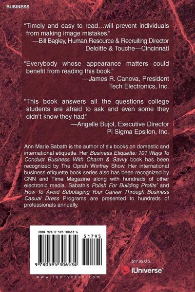 "Timely and easy to read...will prevent individuals from making image mistakes." --Bill Bagley, Human Resource & Recruiting Director Deloitte & Touce--Cincinnati "Everybody whose appearance matters could benefit from reading this book." --James R. Canova, President Tech Electronics, Inc. "This book answers all the questions college students are afraid to ask and even some they didn't know they had." --Angelle Bujol, Executive Director Pi Sigma Epsilon, Inc.